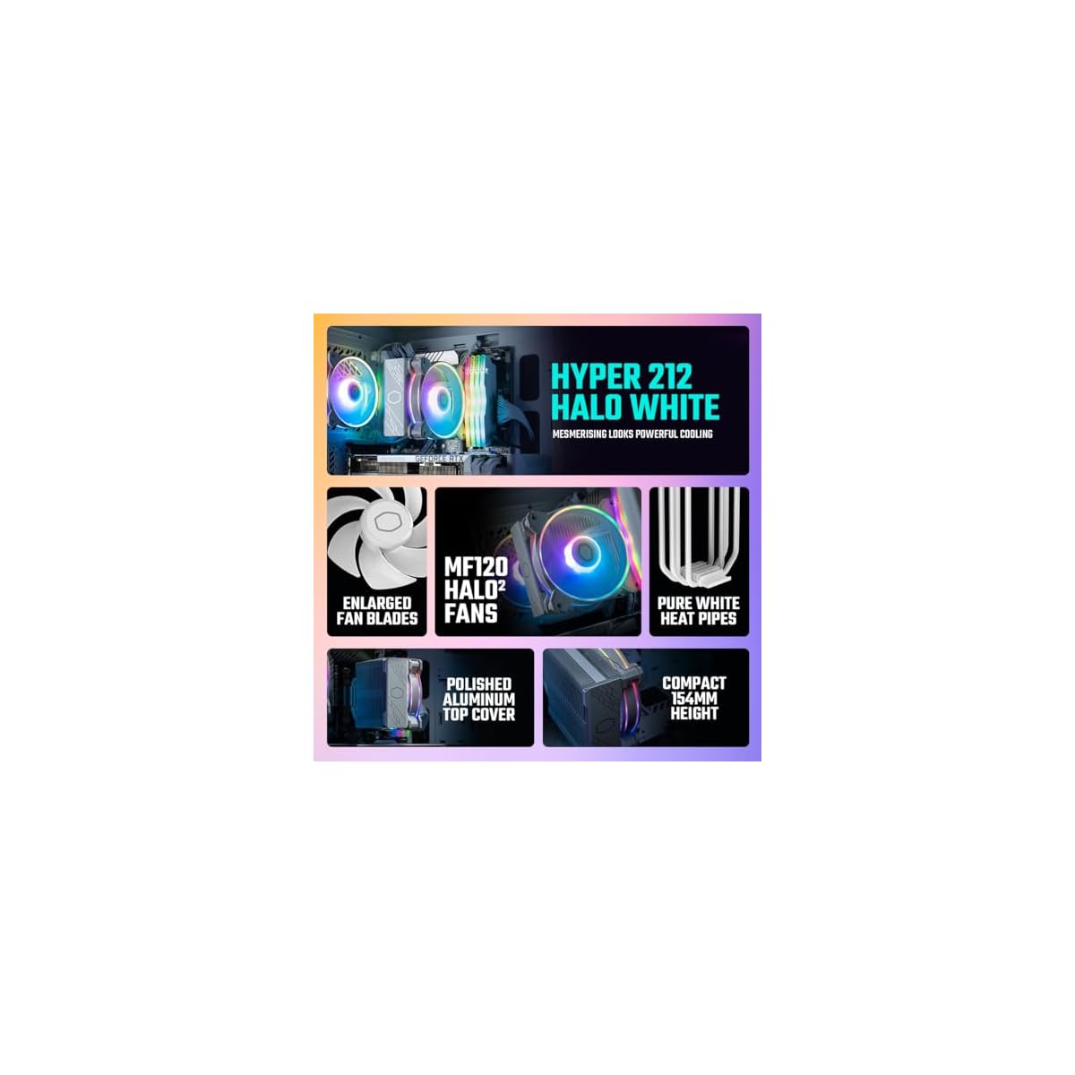 ESTETICA ULTRA RAFFINATA, ARGB GEN 2: 212 Halo presenta design più compatto (124x73x154mm) un’estetica bianca pulita e minimalista; La ventola ARGB Gen 2 da 120mm è compatibile con intestazioni della scheda madre a 3 pin e include rilevamento automatico
