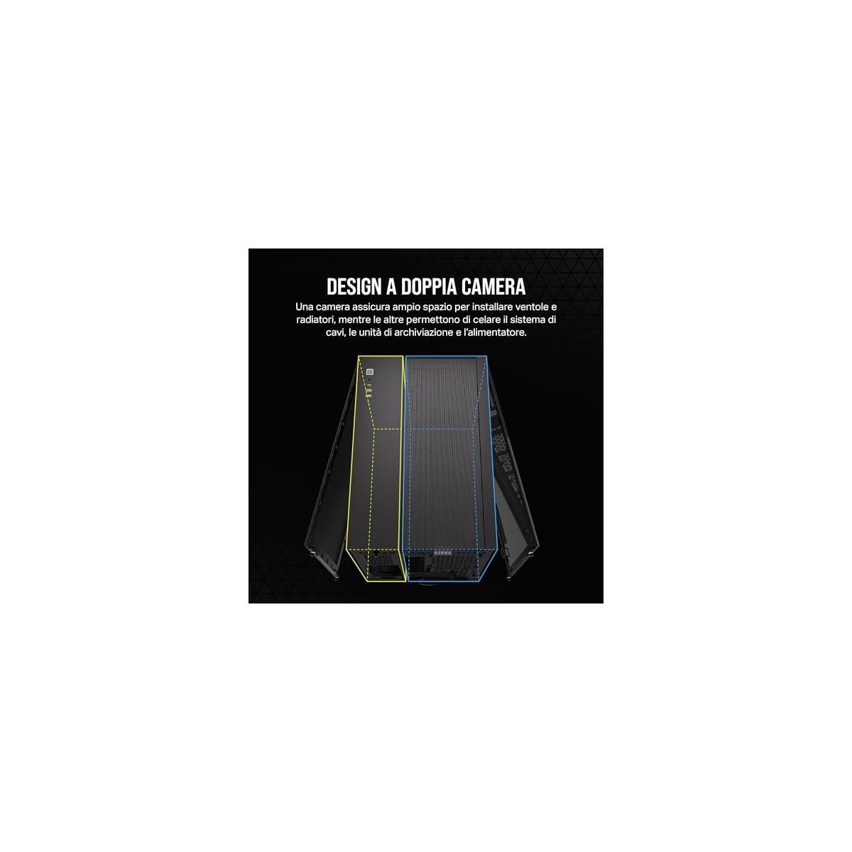 Design a doppia camera: Promuove un raffreddamento efficace e una costruzione più pulita e organizzata, con una camera dotata di numerosi supporti per ventole e radiatori e l’altra che offre spazio in abbondanza per il passaggio dei cavi, l’alloggiamento delle unità e l’installazione dell’alimentatore.