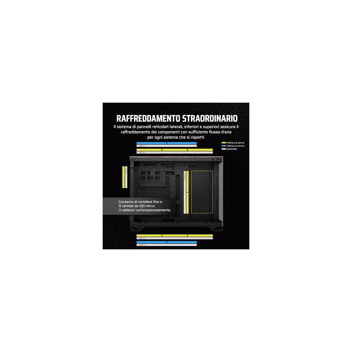 Opzioni di raffreddamento ad ampio raggio: Ottimizzate il raffreddamento con spazio per 9 ventole da 120 mm o 4 da 140 mm, comprese le versatili posizioni di montaggio del radiatore fino a 360 mm sul tetto e sul fondo e spazio per 240 mm sul lato.