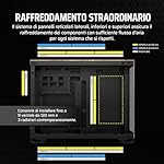 Opzioni di raffreddamento ad ampio raggio: Ottimizzate il raffreddamento con spazio per 9 ventole da 120 mm o 4 da 140 mm, comprese le versatili posizioni di montaggio del radiatore fino a 360 mm sul tetto e sul fondo e spazio per 240 mm sul lato.