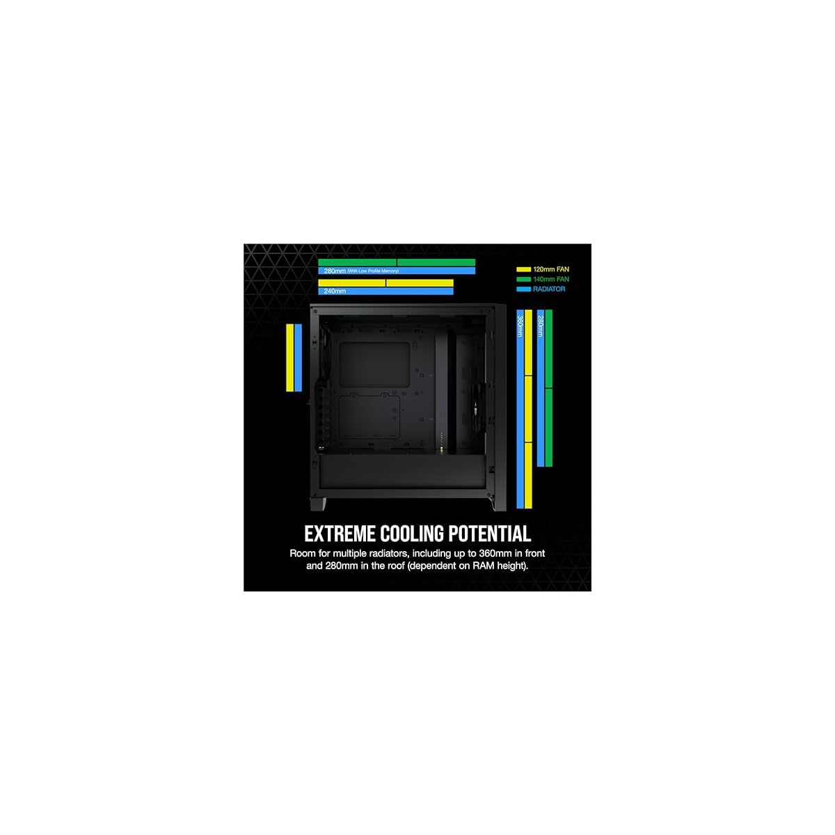 Estremo potenziale di raffreddamento: l’ampio spazio interno ti permette di installare fino a 6 ventole di raffreddamento da 120 mm o 4 ventole da 140 mm, oltre a diversi radiatori, incluso uno da 360 mm sul lato anteriore ed uno da 280 mm sul lato superiore (a seconda dell’altezza del modulo RAM)