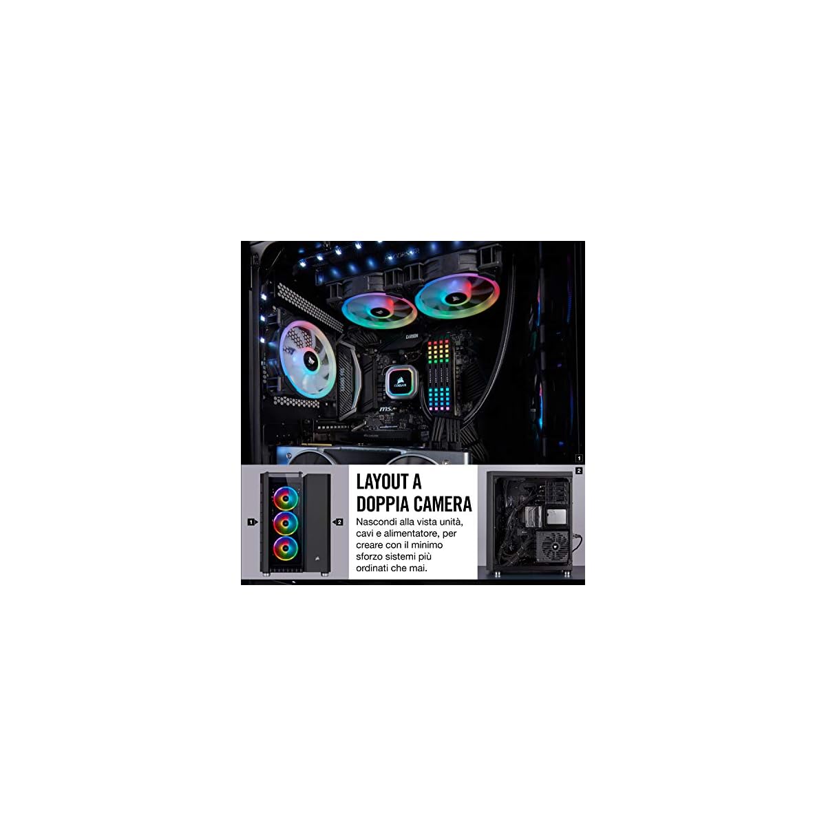 Sistema di raffreddamento con flusso d’aria elevato: quattro ventole di raffreddamento e il layout Corsair Direct Airflow Path direzionano l’aria fredda verso i componenti più caldi del tuo PC