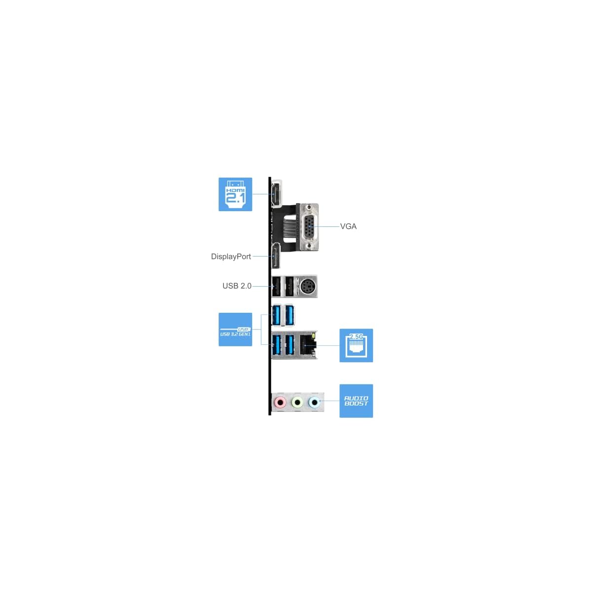 CONNETTIVITÀ 2.5G – L’hardware di rete include un controller LAN 2.5Gbps. Le porte posteriori sono USB 3.2 Gen 1 Type-A (5Gbps), 4K/60Hz HDMI 2.1, DisplayPort 1.4, porta VGA legacy e 7.1 HD Audio con Audio Boost