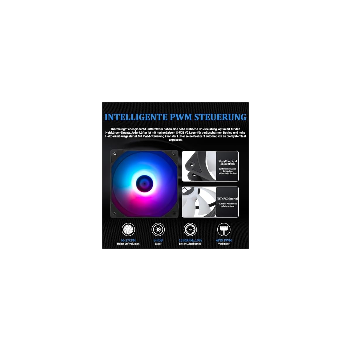 2 ventole PWM: con 2 ventole bilanciate TL-C12C-S ARGB, velocità fino a 1550 RPM±10%, dimensioni pari a 120 x 120 x 25mm, rumorosità da ≤ 25,6 dBA. Interfaccia: 4 pin PWM. Pressione dell’aria: 1,5 mmH2O (massimo). Volume d’aria: 66,17 CFM (massimo), il cuscinetto FDB può risolvere il problema della modalità di sospensione. Con la funzione PWM e ARGB, la velocità può essere regolata automaticamente in base alla temperatura della CPU, fornendo un forte flusso d’aria e meno rumore; il colore della luce ARGB può essere regolato manualmente.