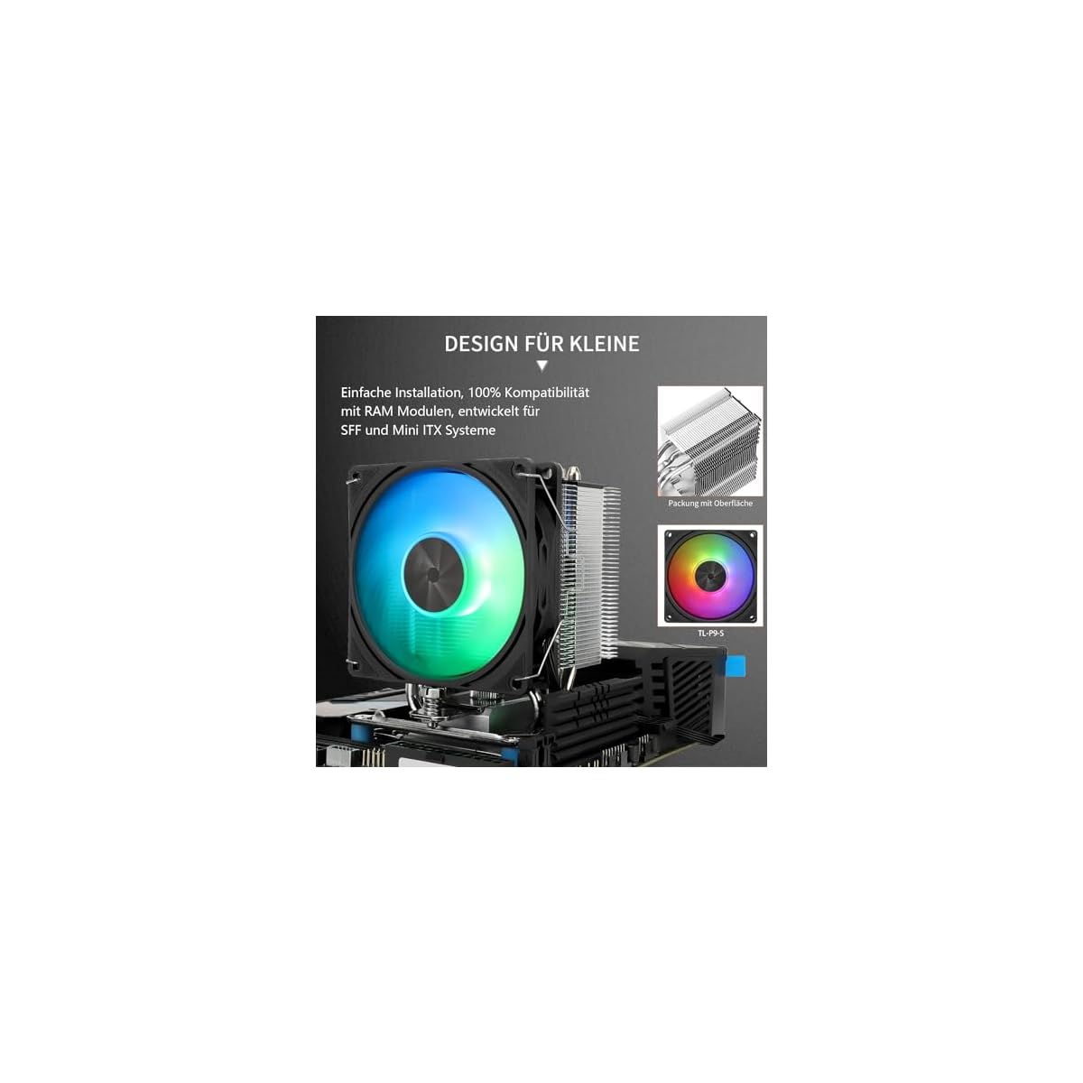 Specifiche del prodotto: AX90SE ARGB; dimensioni del dissipatore di calore: 94 (L)x77(B)x118(H)mm (3,7 x 3,0 x 4,65 pollici); materiale dissipatore: alluminio, il corpo principale adotta il processo touch HDT diretto e fine trattamento superficiale in puro rame, il corpo principale è pieno di lamelle in alluminio per portare la massima superficie di raffreddamento, combinato con Ventola ad alta velocità, può giocare perfettamente il radiatore l’effetto di raffreddamento più forte.