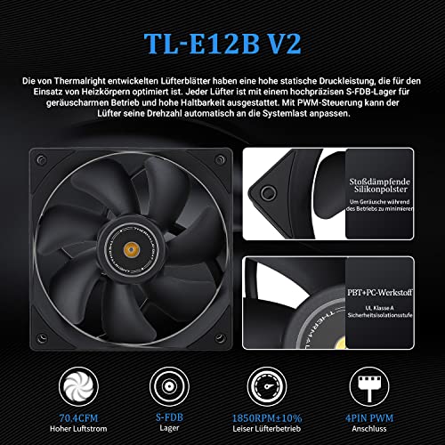 Doppio controllo della temperatura della ventola PWM: con la ventola della serie TL-E12 V2, la ventola della CPU con funzione di controllo della temperatura può regolare automaticamente la velocità in base alla temperatura e l’iniezione della boccola in rame con nucleo in acciaio rende il cuscinetto di tipo S-FDB più evidente, non solo riduce l’attrito e le vibrazioni, ma riduce anche il suono e ne prolunga la durata quando è in funzione. L’elevata velocità di rotazione di 1850 giri al minuto in combinazione con il refrigeratore d’acqua della CPU può dissipare rapidamente le alte temperature.