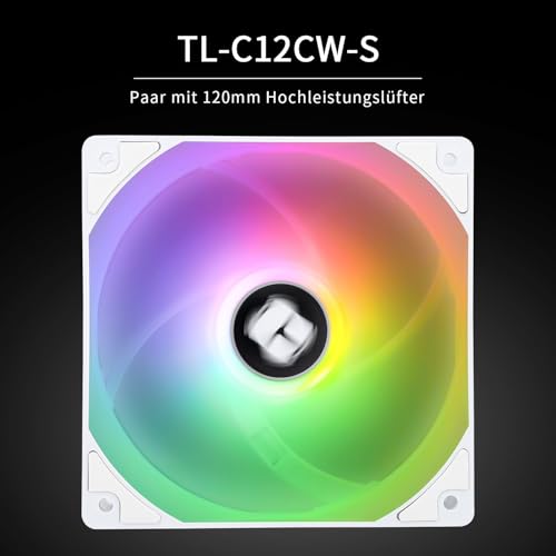【2 ventilatori PWM】Modello:TL-C12C-S; Effetti luminosi ARGB colorati e splendidi; Ventilatore PWM di dimensione standard: 120x120x25mm (4.72×4.72×0.98 pollici); Peso del prodotto: 0.97kg (2.1lb); velocità della ventola (RPM): 1550rpm±10%; porta di alimentazione: 4pin; Tensione:12V; Flusso d’aria: 66.17CFM (MAX); Livello sonoro ≤ 25.6dB (A), lasciare spazio per il chip di memoria (RAM), in modo che l’installazione della CPU di raffreddamento del ghiaccio sia illimitata