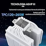 I tubi termici da 6×6mm applicano la tecnica di AGHP, risolvono l’effetto di gravità inversa causato dall’orientamento verticale/orizzontale, TDP del raffreddamento della CPU è da 120 a 265W. 6 tubi di calore sinterizzati in rame puro & ventola PWM & Base in rame puro & processo di saldatura a riflusso galvanizzato completo, quando il raffreddamento della CPU funziona, abbinare con ventilatori ultra-silenziosi del flusso d’aria, mira a prestazioni estreme di raffreddamento della CPU
