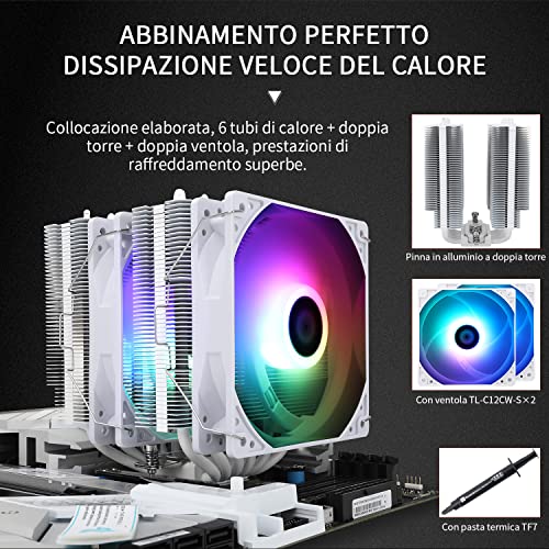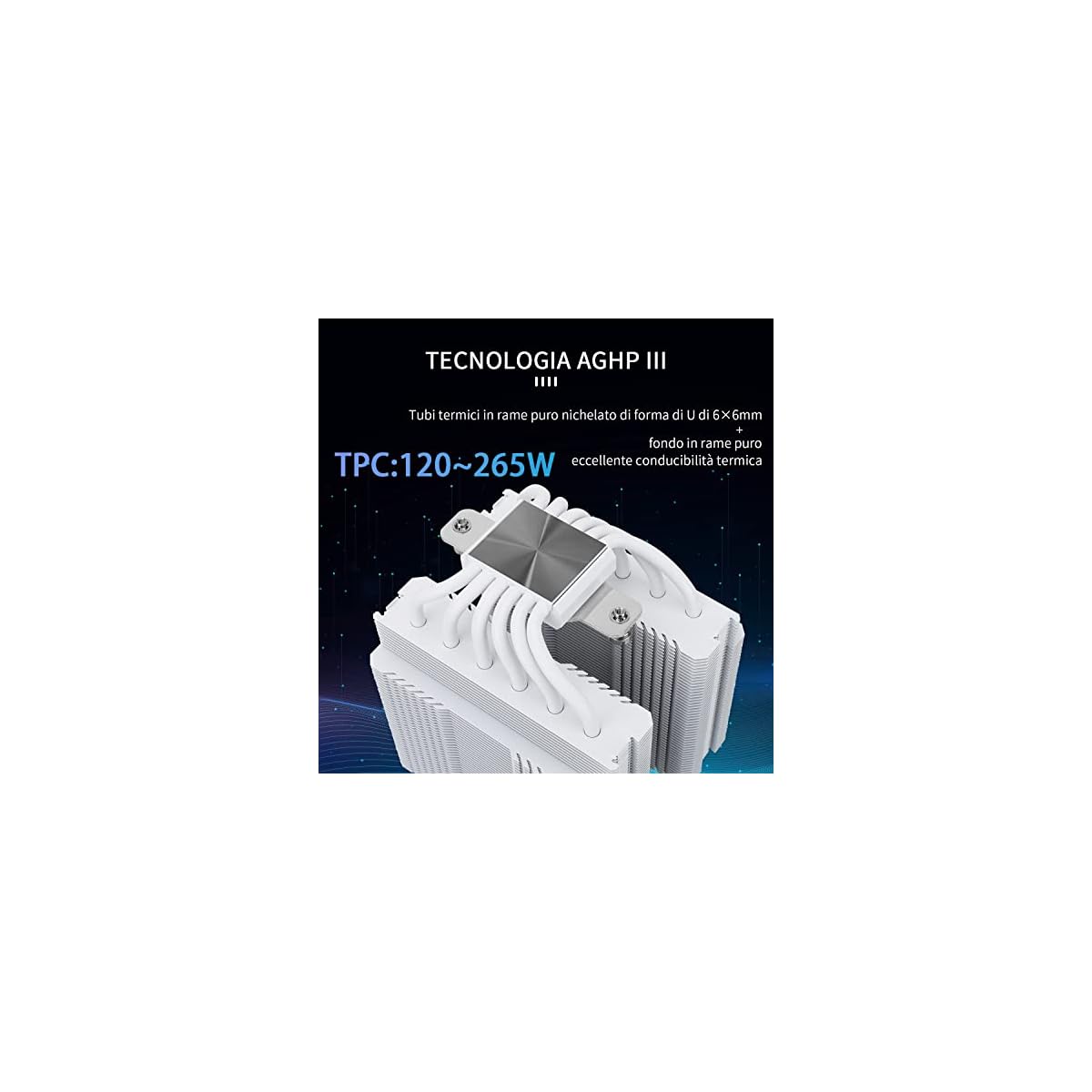 I tubi termici da 6×6mm applicano la tecnica di AGHP, risolvono l’effetto di gravità inversa causato dall’orientamento verticale/orizzontale, TDP del raffreddamento della CPU è da 120 a 265W. 6 tubi di calore sinterizzati in rame puro & ventola PWM & Base in rame puro & processo di saldatura a riflusso galvanizzato completo, quando il raffreddamento della CPU funziona, abbinare con ventilatori ultra-silenziosi del flusso d’aria, mira a prestazioni estreme di raffreddamento della CPU