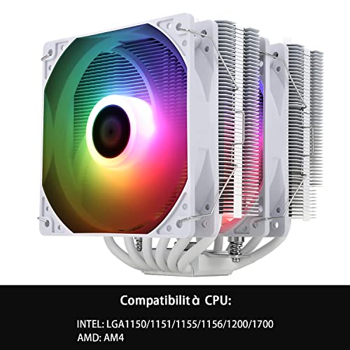 【Specifiche del prodotto】Thermalright PA120 SE ARGB Bianco; Dimensioni del dispositivo di raffreddamento della CPU: 125 (L) x135 (W) x155 (H) mm (4.92×5.31×6.1 pollici); Materiale dissipatore di calore: alluminio, il dispositivo di raffreddamento della CPU è dotato di fissaggi metallici della piattaforma Intel & AMD per ottenere una migliore installazione, il raffreddamento a doppia torre è più forte