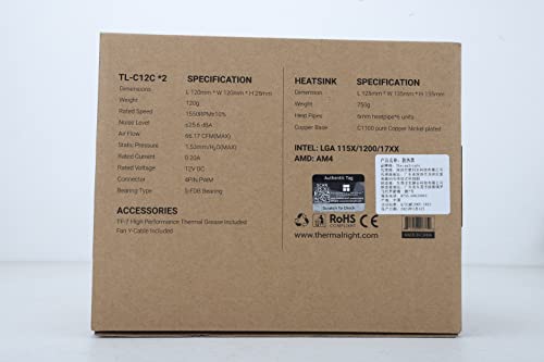 【2 ventilatori PWM】TL-C12C; Ventilatore PWM di dimensione standard: 120x120x25mm (4.72×4.72×0.98 pollici); Peso del prodotto: 0.97kg (2.1lb); velocità della ventola (RPM): 1500rpm±10%; porta di alimentazione: 4pin; Tensione:12V; Flusso d’aria: 66.17CFM (MAX); Livello sonoro ≤ 25.6dB (A), lasciare spazio per il chip di memoria (RAM), in modo che l’installazione della CPU di raffreddamento del ghiaccio sia illimitata